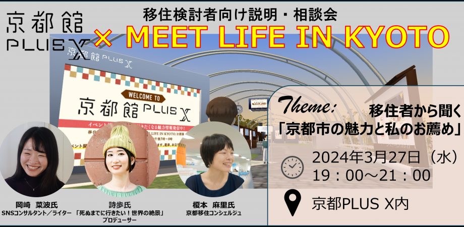 3月27日(金)夜、京都市さんが主催するイベント『MEETS LIFE IN KYOTO×京都館PLUS X~移住者から聞く「京都市の魅力と私のお薦め」~』に登壇します。