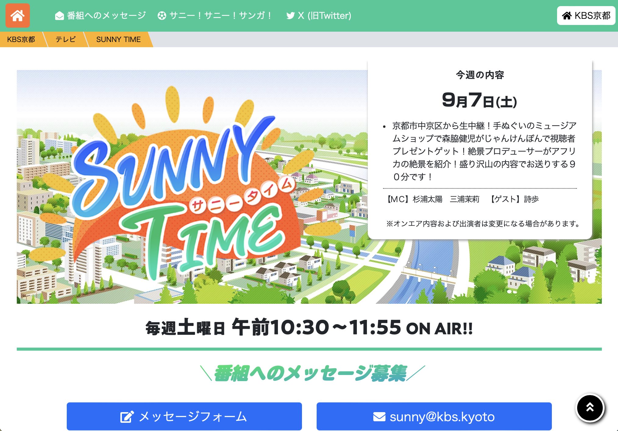 2024-09-06 Home › NEWS/お知らせ TV/テレビ › 【テレビ】9月6日(土)KBS京都「サニータイム」生出演します 【テレビ】9月6日(土)KBS京都「サニータイム」生出演します 2月3日(土)にKBS京都「サニータイム」にスタジオから生出演します! 放送は土曜10時半〜。ぜひご覧ください! 関連記事 【テレビ】4/10(土) KBS京都「キモイリ!」に出演します 10/27(日)日テレ系「行列のできる法律相談所」に出演しています 12/25 BS-TBS「日本発着!海外行った気リゾート」出演します 出演したTV番組「ワケあり!レッドゾーン」TVerで視聴できます! テレビ「林先生が驚く 初耳学!」にて書籍「死ぬまでに行きたい!世界の絶景」が紹介されました(*゚∀゚) 【テレビ】7/14日本テレビ「スクール革命!」出演します 【テレビ】12/8 日本テレビ「スクール革命!」出演します