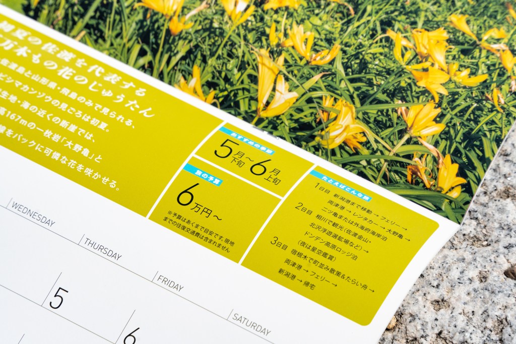 絶景写真はもちろん、実際に旅をするときに参考になる「旅の予算」「スケジュール」も掲載しているので、カレンダーを眺めるだけで旅気分を味わえること間違いなし!