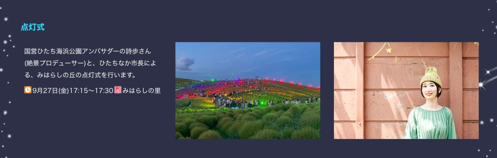 私がアンバサダーを務める、茨城県ひたちなか市「国営ひたち海浜公園」で開催される「コキアライトアップ点灯式」に、ひたちなか市市長と登壇します。