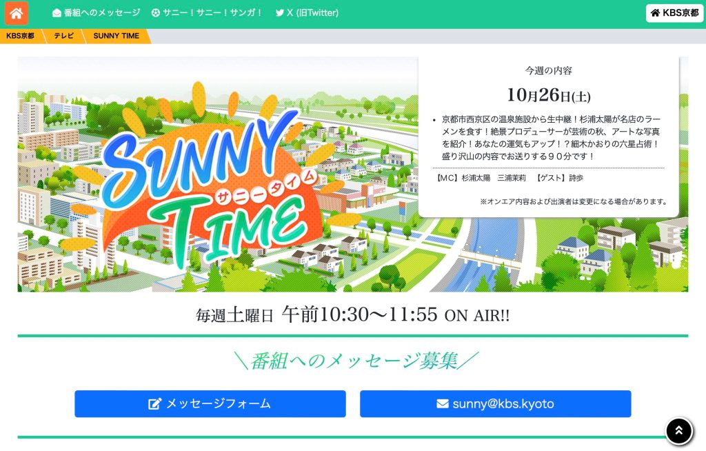 10月26日(土)にKBS京都「サニータイム」にスタジオから生出演します!