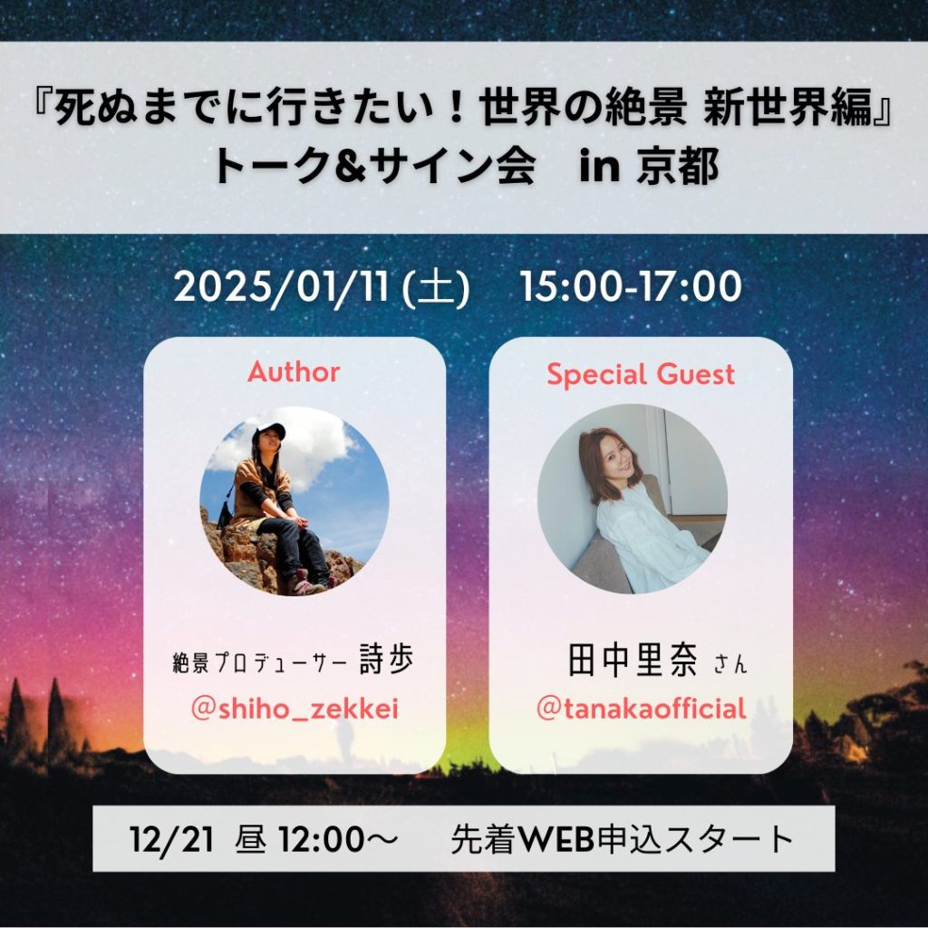 当日は、モデル・プロデューサーとして活動する田中里奈さんをお迎えして、書籍『死ぬまでに行きたい! 世界の絶景 新世界編』の制作秘話や、おふたりが実際に絶景を旅した体験ついて、お話しいただきます。トークイベントの後には詩歩さんのサイン会も開催いたします。