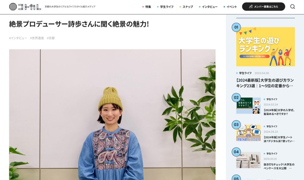 京都学生広報部(京都市と大学コンソーシアム京都により設立された学生団体)が運営するWebサイト「コトカレ」にインタビュー記事が掲載されています。