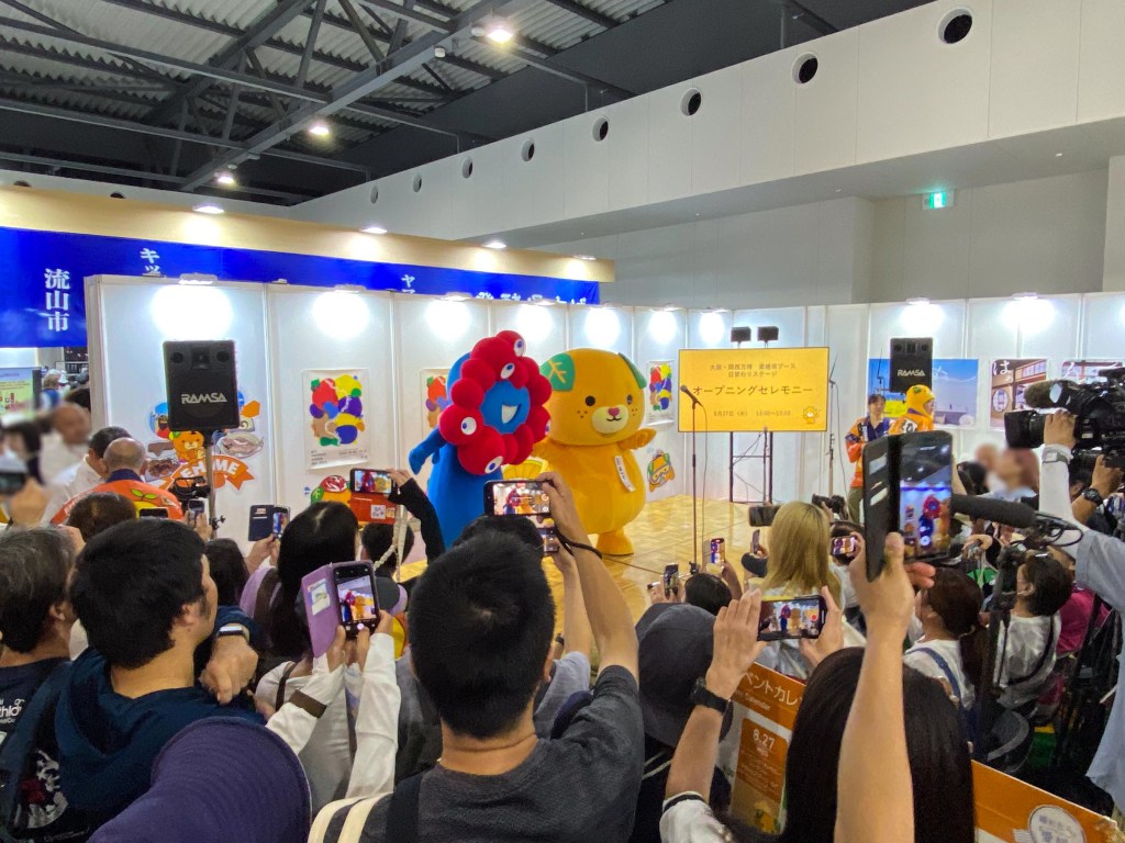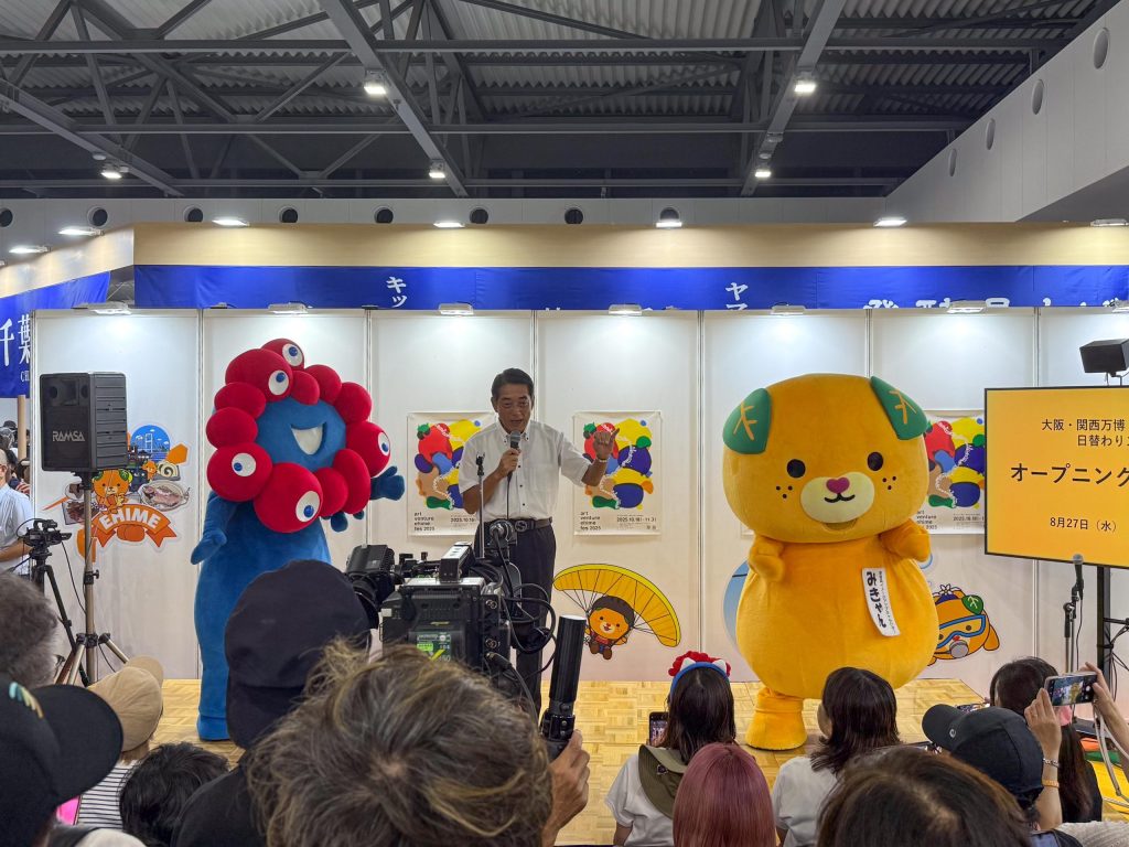 中村知事が登壇されたオープニングセレモニーでは、なんと「みきゃん」と「ミャクミャク」のコラボが実現…!!