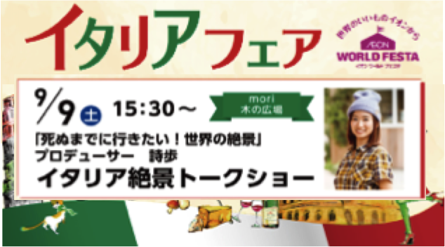 9/9(土)15:30〜@越谷イオンレイクタウン「イタリアフェア」にてトークイベント登壇します(*゚∀゚)