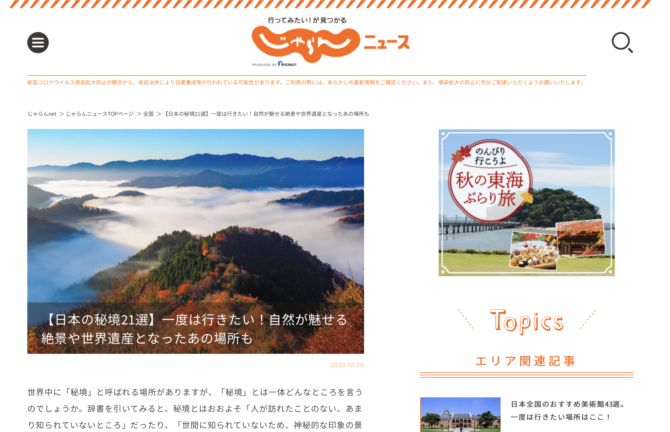 旅行メディア「じゃらんニュース」さんの記事が公開されました。 テーマは『【日本の秘境21選】一度は行きたい!自然が魅せる絶景や世界...